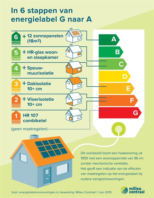 Het energielabel geeft de prestatie weer op het gebied van het energieverbruik van een woning. Alle factoren die van invloed zijn worden hierin meegenomen zoals de isolatie, ventilatie en de installaties die aanwezig zijn in de woning. Het doel van het energielabel is om inzicht te geven en bewoners te stimuleren tot het nemen van duurzame maatregelen. Door het energielabel worden deze investeringen direct zichtbaar en zorgen dus voor waardeverbetering van de woning. Hieronder vind je hoe je in 6 stappen van energielabel G naar energielabel A kan stijgen.